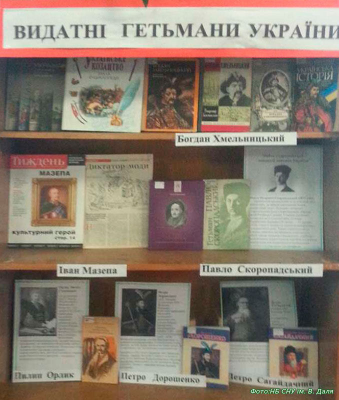 Для перегляду представлені книги та журнальні статті про життя і діяльність гетьманів, написані авторами різних епох і з різним баченням ролі козацьких атаманів в історії України, представлені художні твори (М. Старицького, І. Ле, Г. Сенькевич, П. Меріме), ілюстративні матеріали про те, як зберігається в Україні пам’ять про героїчний період історії нашої держави – в мистецтві (живопису і численних пам’ятниках в українських містах ), в містобудуванні (в назвах вулиць, площ і міст), у військовій справі, в музейній справі. Сподіваємось, що книжкова виставка приверне до себе вашу увагу, викличе щирий інтерес до історії України козацької доби та особистостей відомих українських гетьманів, які боролись за майбутнє України, захищали землі від нападників, керували та намагалися покращувати життя простих людей.