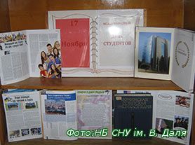 В читальному залі бібліотеки університету до Дня студентів організувано книжкову виставку. День студента  відзначається щорічно 17 листопада. Свято встановлено в Україні «…на підтримку ініціативи студентської молоді України…» згідно з Указом Президента України “Про День студента” від 16 червня 1999 р. № 659/99. Шановні студенти! Прийміть щирі вітання зі святом, а також побажання здоров’я, успіхів та активної життєвої позиції. Саме …