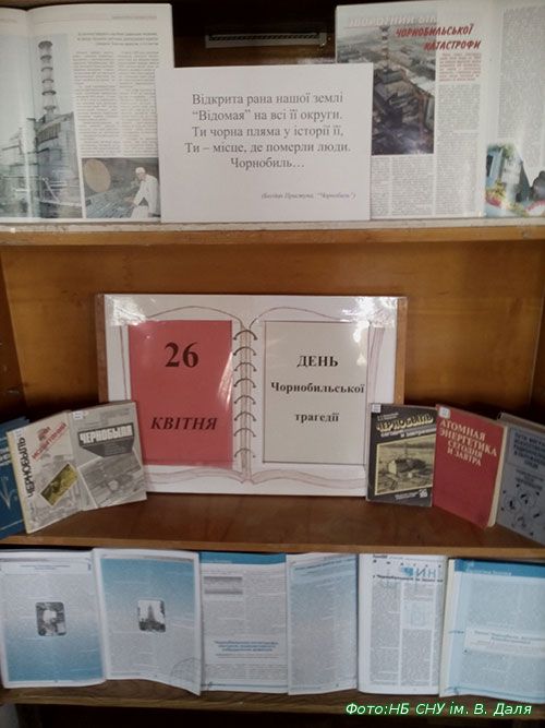 26 КВІТНЯ 2016 РОКУ ВИПОВНЮЄТЬСЯ 30 РОКІВ  ЧОРНОБИЛЬСЬКІЙ трагедії. 26 квітня 1986 року о 01.23 сталася найжахливіша техногенна катастрофа в історії людства – вибухнув реактор четвертого енергоблоку Чорнобильської АЕС. Ця подія зачепила життя — за різними оцінками — понад 9 мільонів людей. Серед усіх трагедій, які пережило людство, чорнобильська катастрофа не має аналогів за масштабами рукотворного забруднення екологічної сфери, негативного впливу на здоров’я, психіку людей, їх соціальні, економічні і побутові умови життя. З  2004 року  26 квітня оголошено Міжнародним днем пам’яті жертв радіаційних аварій і катастроф. Бібліотека підготувала віртуально-інформаційну виставку “Чорнобиль…Відкрита рана нашої  землі…” та організувала виставку-перегляд матеріалів, в яких представлені історія будівництва станції, причини аварії, її наслідки, заходи щодо їх ліквідації.