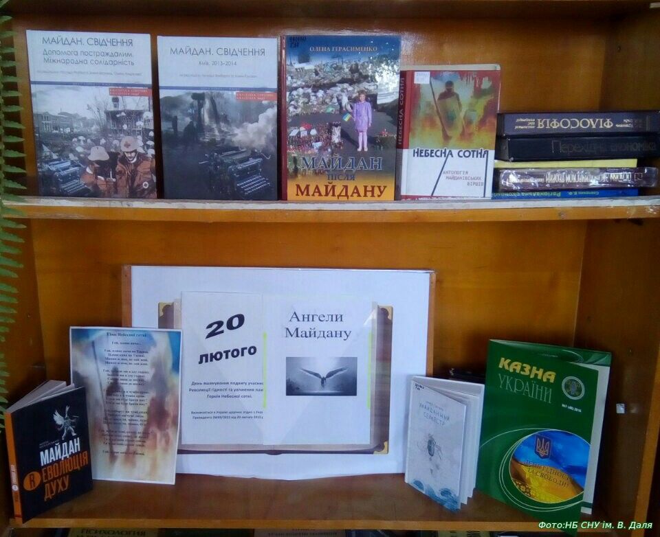 На вшанування пам’яті Героїв Небесної Сотні та подвигу учасників Революції гідності у читальному залі бібліотеки організовано ілюстративно-книжкову виставку “Ангели Майдану”