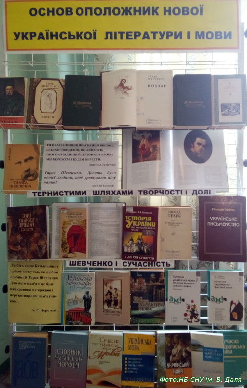 Увазі користувачів пропонуються книги про життя і творчість Тараса Григоровича Шевченка, твори Кобзаря, представлені на виставці у розділі “Тернистими шляхами творчості і долі”, а в розділі “Шевченко і сучасність” – підручники та навчальні посібники з мовознавства, книги про вшанування пам’яті поета в Україні. Виставка організована у відділі абонементу. ![]() |