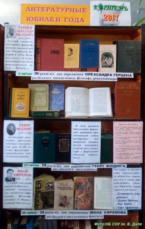 | У відділі художньої літератури оформлена книжкова виставка із циклу «Літературні ювілеї року». Виставка присвячена ювілейним датам, що відзначаються у квітні 2017 року. До уваги читачів пропнуються літературні твори, ілюстративні матеріали про життя і творчість письменників (Див фото). Запрошуємо наших читачів відвідати бібліотеку і познайомитися з матеріалами, наданими на виставці. ![]() |