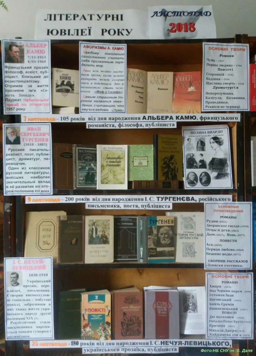 Вашій увазі пропонується книжкова виставка, що познайомить з цікавими фактами життя і творчості письменників-ювілярів листопада – І.С. Нечуя-Левицького, А.Камю, І.С. Тургенєва, та розкриє захоплюючий світ їхніх творів.![]() |