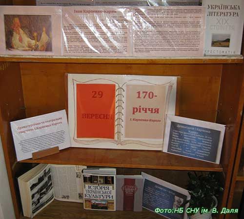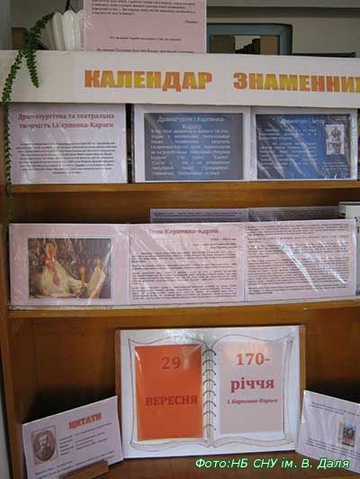 29 вересня виповнюється 170 років від дня народження Карпенко-Карого, яний створив найзвичніші художні цінності в українській драматургії ХІХ – початку ХХ ст. За словами І. Франка “він був одним із батьків новочасного українського театру, визначним артистом, та при тім, великим драматургом, якому щодо ширини і багатства творчості, артистичного викінчення і глибокого продумання тем бистрої обсервації життя та ясного і широкого світогляду не дорівнює ані один із сучасних драматургів не тільки Росії, але й інших народів”. Видатний драматург, актор, режисер, один із основоположників українського професіонального театру, Іван Карпович Тобілевич (псевдонім – І. Карпенко-Карий, 1845-1907) належить до тих славних діячів вітчизняної культури, якими пишається наш народ. Продовжуючи традиції Т. Шевченка, він відіграв велику роль у боротьбі за реалізм, народність, ідейність української літератури й театрального мистецтва. За двадцять років творчої діяльності І. Карпенко-Карий написав близько двох десятків п’єс різних жанрів. Серед них – побутові драми з життя села, гостросатиричні комедії, історичні трагедії тощо. Його п’єси засвідчили дальший розвиток української класичної драматургії. Бібліотека пропонує увазі користцвачів виставку, де представлені твори, документально-іллюстративні джерела, матеріали про життя і творчість І. Карпенка-Карого, літературознавчі статті. Прикрашають виставку ілюстративні добірки та крилаті вирази з п’єс, які розкривають яскравість, глибину і мудрість особистості великого українського драматурга. ![]() ![]() |