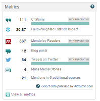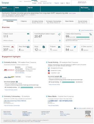 З 29 липня 2015 в Scopus доступний новий модуль, який демонструє набір альтернативних статейних метрик. На додаток до традиційних показників, новий модуль показує кількість цитувань статті в онлайн-джерелах, блогах, соцмережах і ЗМІ, даючи користувачам більш повне уявлення про значення опублікованих наукових результатів. Компактний модуль на бічній панелі статейної сторінки в Scopus містить наступні показники: ![]() • Field-Weighted Citation Impact (FWCI) • Кількість прочитувань в Mendeley, CiteULike • Кількість коментарів одного типу в наукових блогах або Вікіпедія • Кількість одного типу згадок в соціальних мережах (Twitter, Facebook, Google +) • Згадки в ЗМІ • Загальна кількість згадок в додаткових джерелах Крім того, в Scopus введений порівняльний показник, який відображає співвідношення цитувань або згадок конкретної статті і середнього показника для подібних статей, беручи до уваги дату публікації, тип публікації та дисципліни, пов’язані з її джерелом. Для того щоб побачити повну версію модуля з детальним оглядом всіх доступних метрик, потрібно перейти за посиланням View all metrics. ![]() |