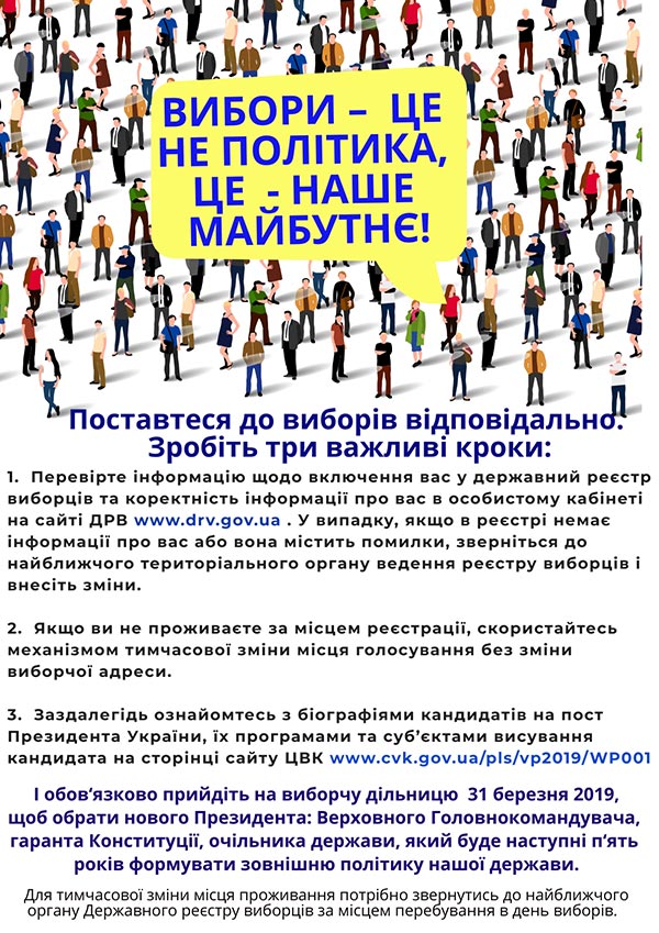 Голосування за Президента України заплановане на 31 березня 2019 року з 8-ої до 20-ої години вечора. Брати участь у виборах можуть усі громадяни, яким виповнилося 18 років.