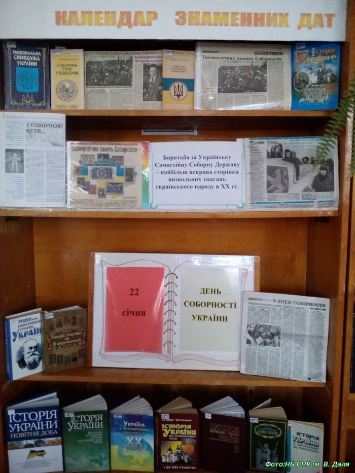 Щороку 22 січня в Україні відзначається державне свято – День Соборності України. У цей день в 1919 році був проголошений Акт возз’єднання Української Народної Республіки й Західноукраїнської Народної Республіки. Офіційно в Україні День Соборності відзначають з 1999 року. Ми, українці, – єдиний народ, а Україна – єдина держава, яка мужньо перенесла і переносить найважчі випробовування. До цього свята бібліотека підготувала і пропонує книжкову виставку, що експонується у читальному залі, а також презентацію “УКРАЇНА СОБОРНА” . Запрошуємо до перегляду. ![]() |