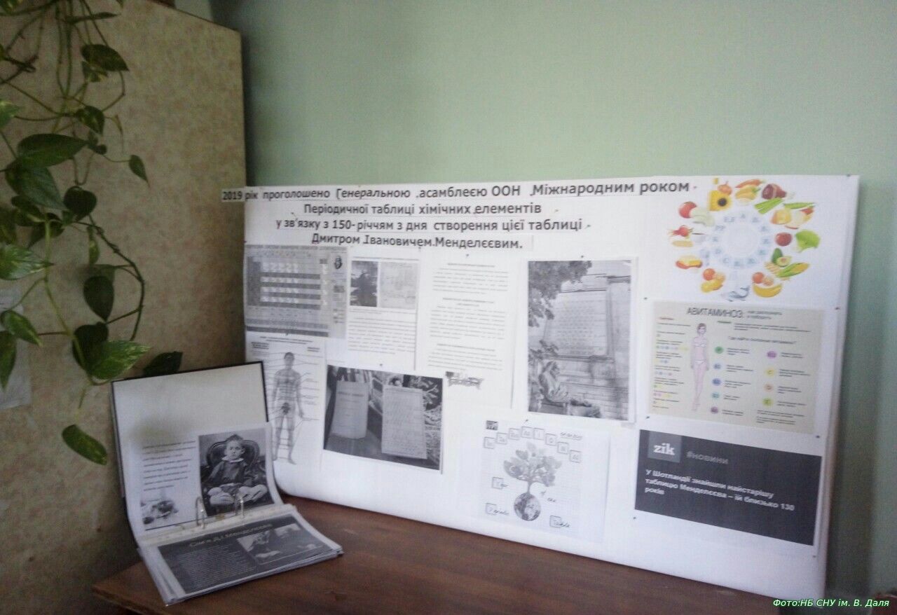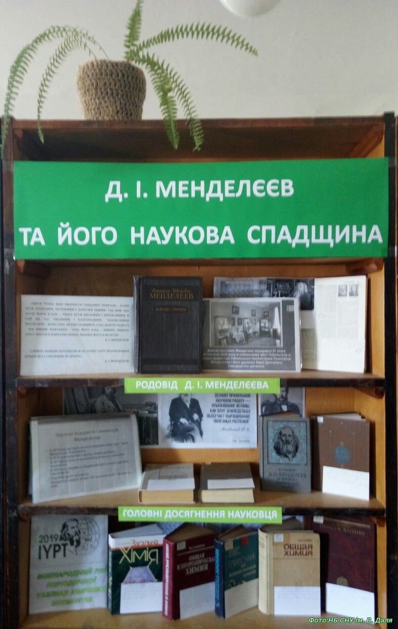 Як відомо, Організація Об’єднаних Націй проголосила 2019 рік — роком Періодичної таблиці хімічних елементів. У лютому відзначаються дві важливі дати: 185 років від дня народження великого вченого Дмитра Менделєєва, який відкрив один з фундаментальних законів природи — періодичний закон хімічних елементів. До речі, це відкриття відбулось 150 років тому. Бібліотека підготувала книжкову виставку “Д. І. Менделєєв та його наукова спадщина” та інформаційний стенд, що познайомить з цікавинками про хімічні елементи з Періодичної таблиці.