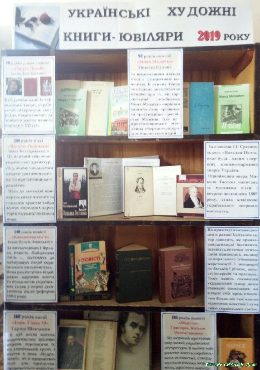 Ще одна виставка – “Українські художні книги-ювіляри 2019”, де експонуються самі твори, а також надається інформація про авторів – видатних українських письменників.