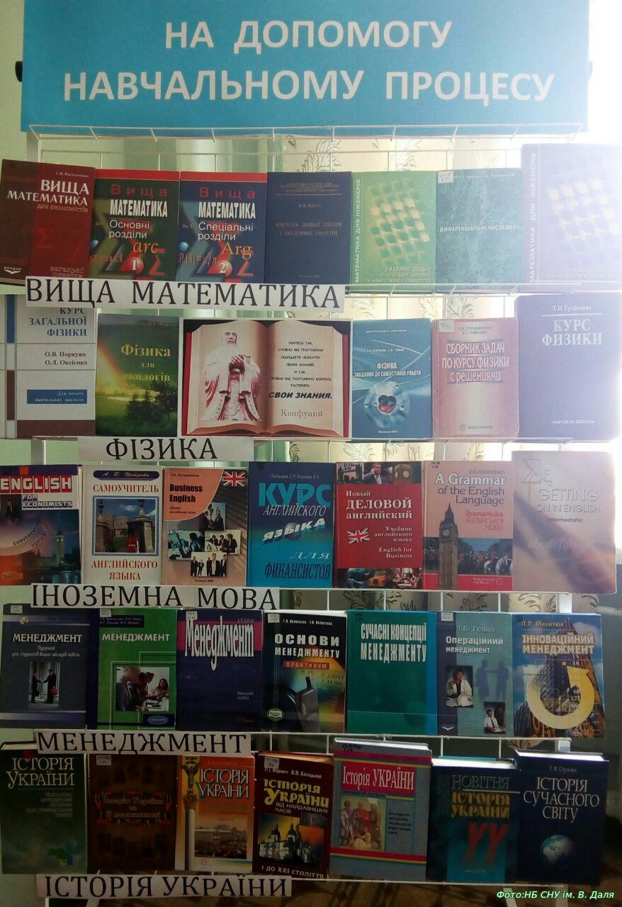 Шановні користувачі! Бібліотека підготувала декілька цікавих книжкових експозицій і чекає на вас. В читальному залі вашій увазі пропонуються виставки “Нові надходження” та “Книжкова скарбниця СНУ ім. В. Даля”. На абонементі навчальної літератури розгорнуті одразу три виставки. Виставка “На допомогу навчанню” познайомить з новими підручниками, навчальними посібниками з деяких дисциплін, а саме з вищої математики, фізики, іноземних мов, історії України, менеджменту, а також довідковою літературою, що стане у нагоді під час навчання.