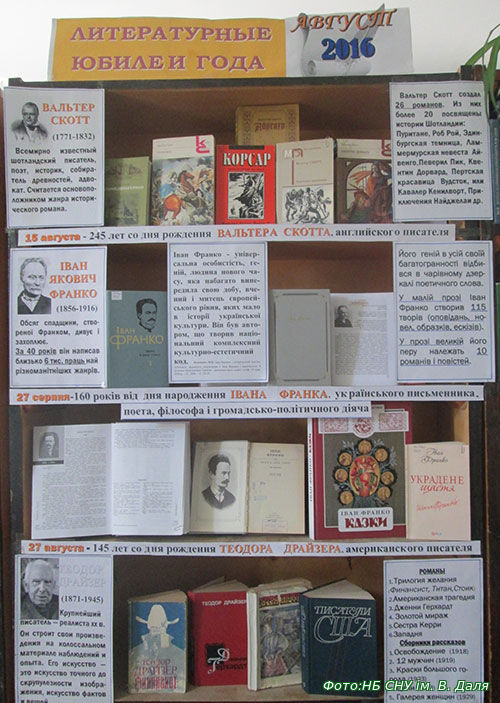 Он считается основоположником жанра исторического романа. Из 26 его романов только 1 посвящен современности и почти все – истории Шотландии: Пуритане, Роб Рой, Эдинбургская темница, Ламмермурская невеста, Айвенго, Певерил Пик, Квентин Дорвард и др. Його геній в усій своїй багатогранності відбився в чарівному дзеркалі поетичного слова. У малій прозі Іван Франко створив 115 творів (оповідань, новел, образків, ескізів). У прозі великій його перу належать 10 романів і повістей. На выставке представлены литературные произведения, иллюстративные материалы о жизни и творчестве писателей.